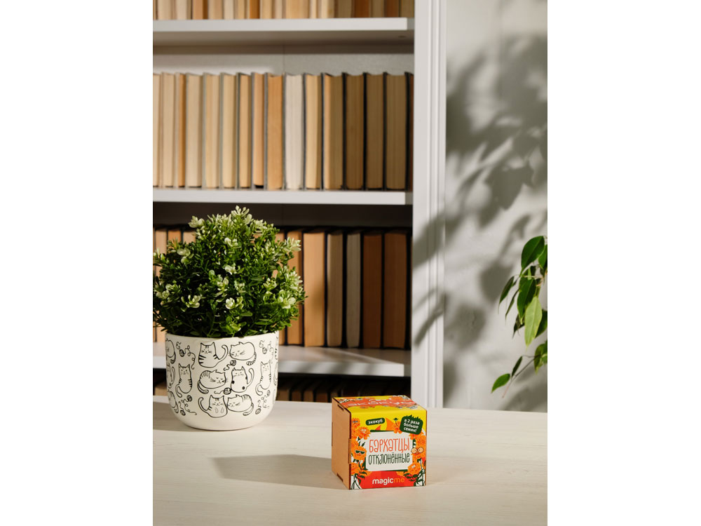 Набор включает: кубический горшок из натуральной берёзовой древесины, семена и специальный питательный грунт, подходящий для конкретного сорта.