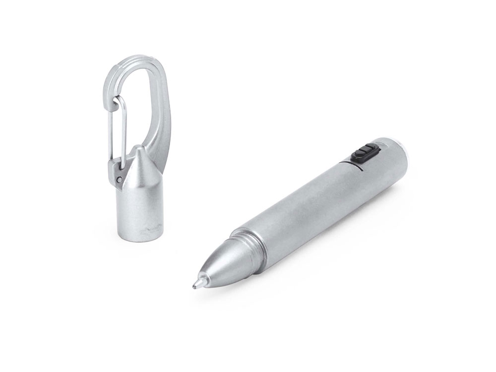 Ручка со светодиодным фонариком, доступна в различных цветах с металлическим покрытием и черной кнопкой. Встроенный карабин. Синие чернила Тампопечать (1 цвет (цветные изделия)) на данный товар осуществляется бесплатно. Оплачивается только настройка оборудования в размере 4500 рублей на весь тираж.