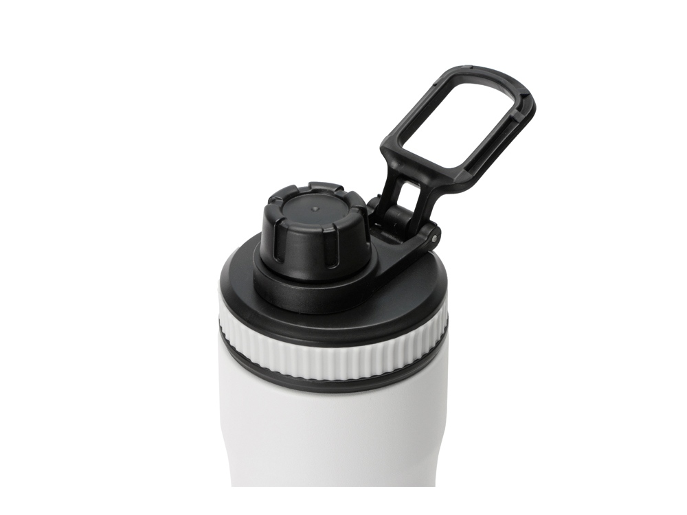 Крышка оснащена складной ручкой-держалкой, которая может быть использована для подвешивания или переноски, а также нетеряемым колпачком. Широкое питьевое отверстие позволяет быстро утолить жажду во время занятий спортом. Рельефное силиконовое кольцо по краю крышки поможет вам быстро и легко отвинтить ее от бутылки.