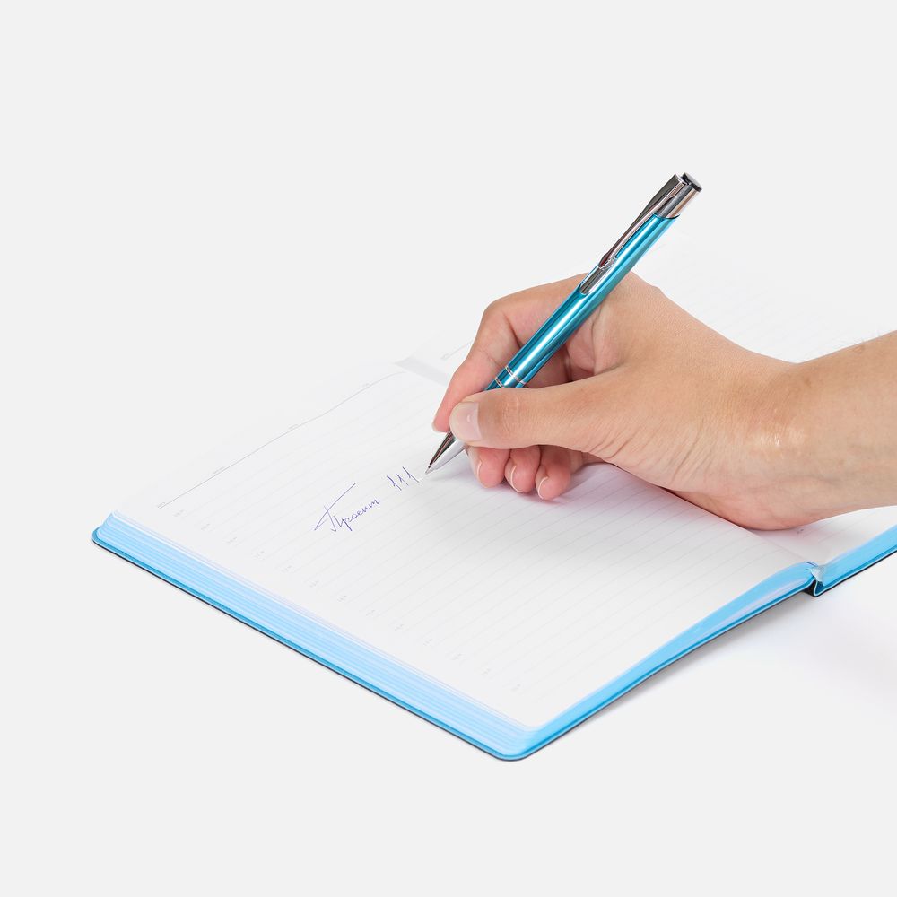 Яркая шариковая ручка с глянцевым цветным корпусом и хромированными деталями.