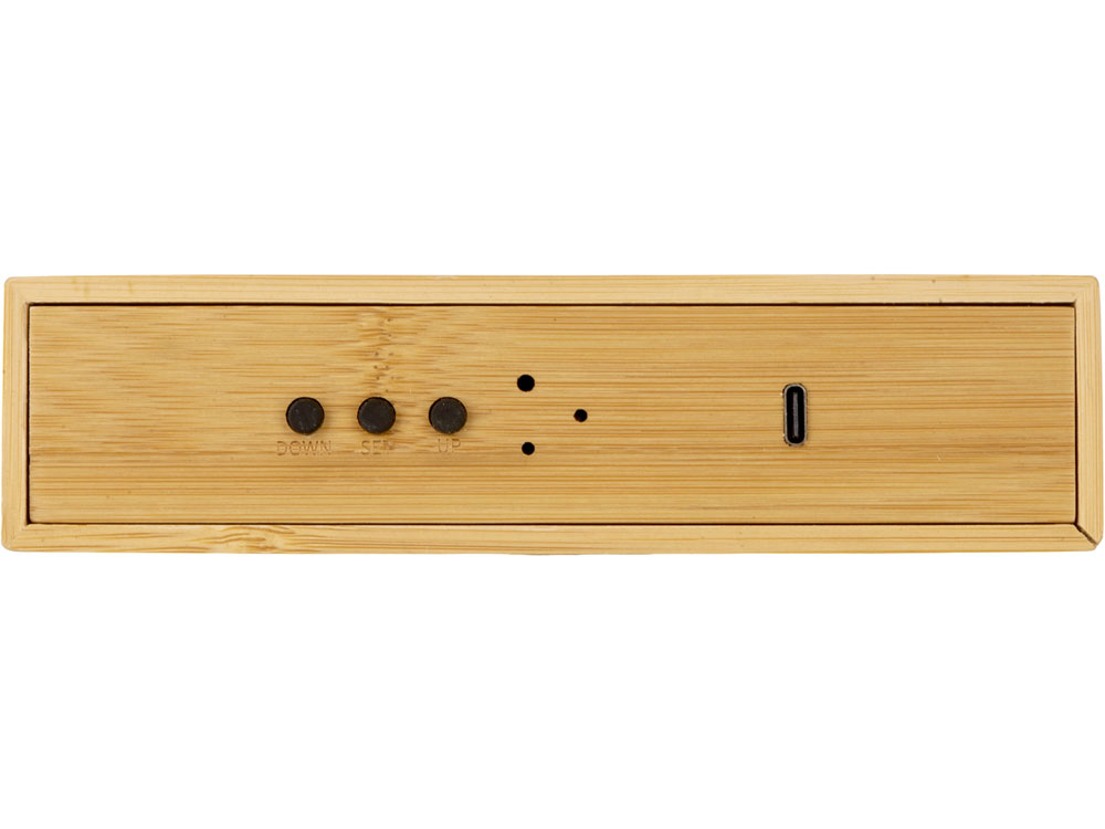 Настольные часы с корпусом из бамбука, имеют функцию беспроводной зарядки для смартфонов (10 Вт). Яркий дисплей. Функция измерения температуры окружающей среды.