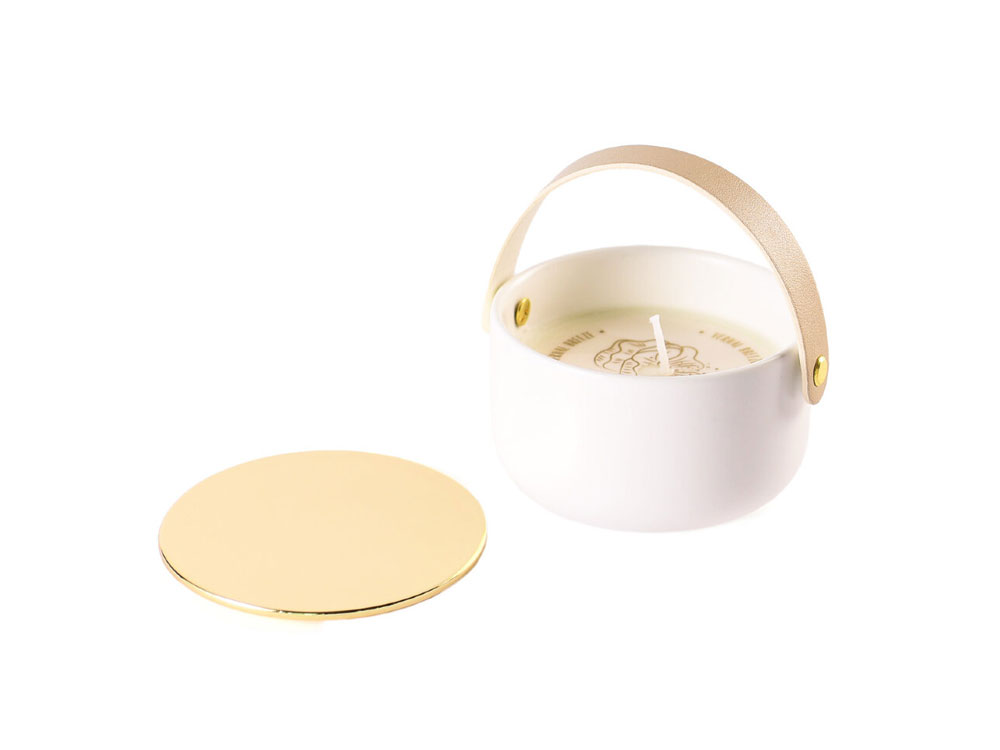 Стильная свеча в фарфоровом кашпо с крышкой и кожаными ручками от Valerie Concept. Изготовлена из натурального соевого воска с хлопковым фитилем, подарит вам долгие часы наслаждения и умиротворения, благодаря нежному аромату с нотками чарующих цветов и хлопка.