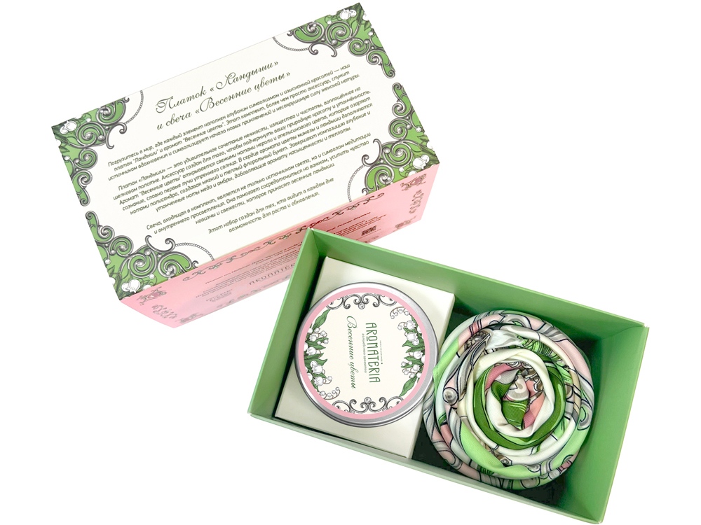 Аромат свечи Весенние цветы открывается свежими нотами апельсинового цвета, мимозы и ландыша, завершая флоральный букет аккордами меда и амбры.