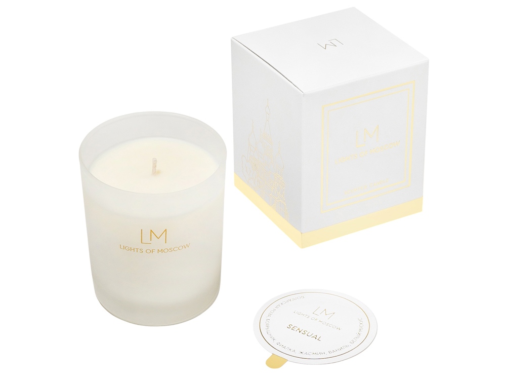 Коллекция аромасвечей Exclusive является уникальной не только из-за ароматов коллекции, но и благодаря тщательно разработанному дизайну упаковки, которая является напоминанием о том, что бренд Lights of Moscow - это ручное российское производство в самом центре Москвы. Белая коробка оформлена ярким золотым фольгированием, на левой стороне которой изображен Храм Василия Блаженного - одна из главных достопримечательностей на Красной площади в Москве.