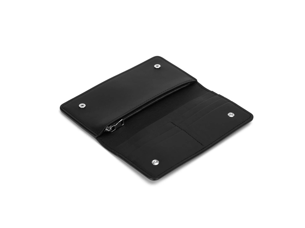 Внутри бумажника есть отделения для карт, купюр и широкое отделение, застегивающееся на молнию. Бумажник закрывается на кнопки, это сделано для того, чтобы он оставался закрытым где бы вы его не носили. Края бумажника окрашены в ручную.
