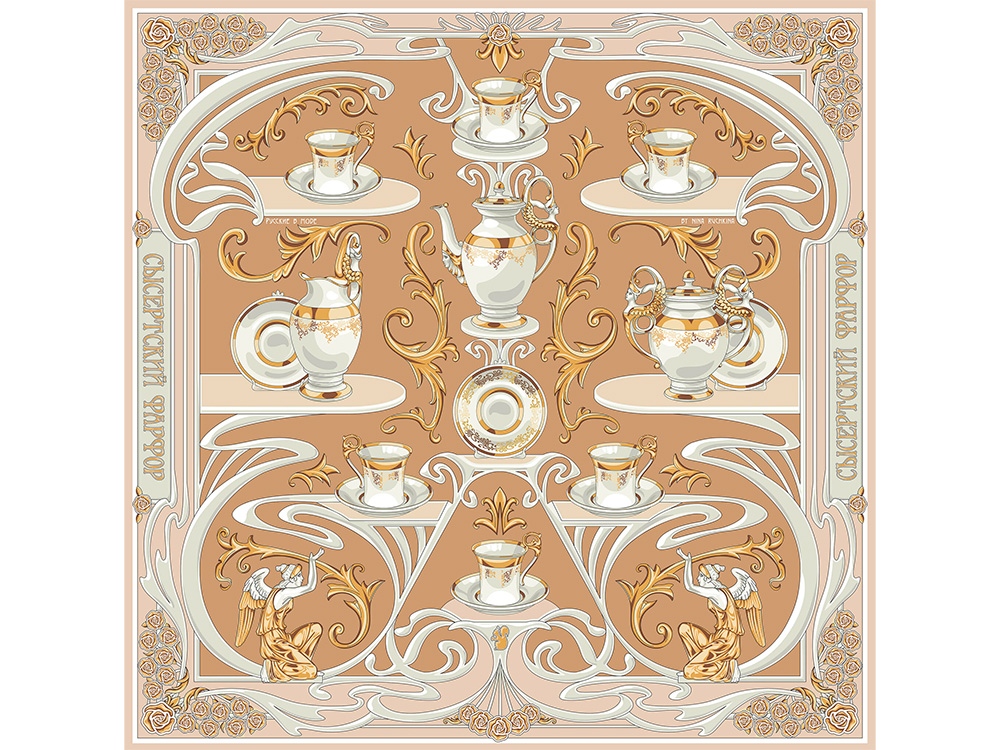 Композиция платка словно сказочный лабиринт увлекает за собой, вызывая желания рассматривать детали утонченного сервиза работы уральских мастеров. Изящные фарфоровые предметы расположены в ажурном серванте эпохи модерна.