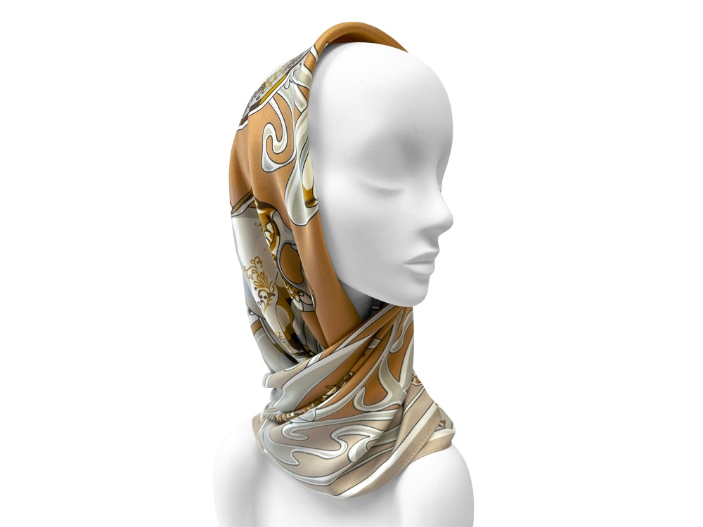 Сочетания благородного золота и слоновой кости, плавные линии и стилизованные цветы рождают необычайно элегантный дизайн авторского аксессуара. Такой платок привнесет дополнительный шик как в базовый гардероб, так и в вечерний стиль.