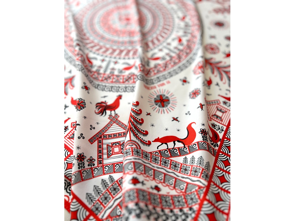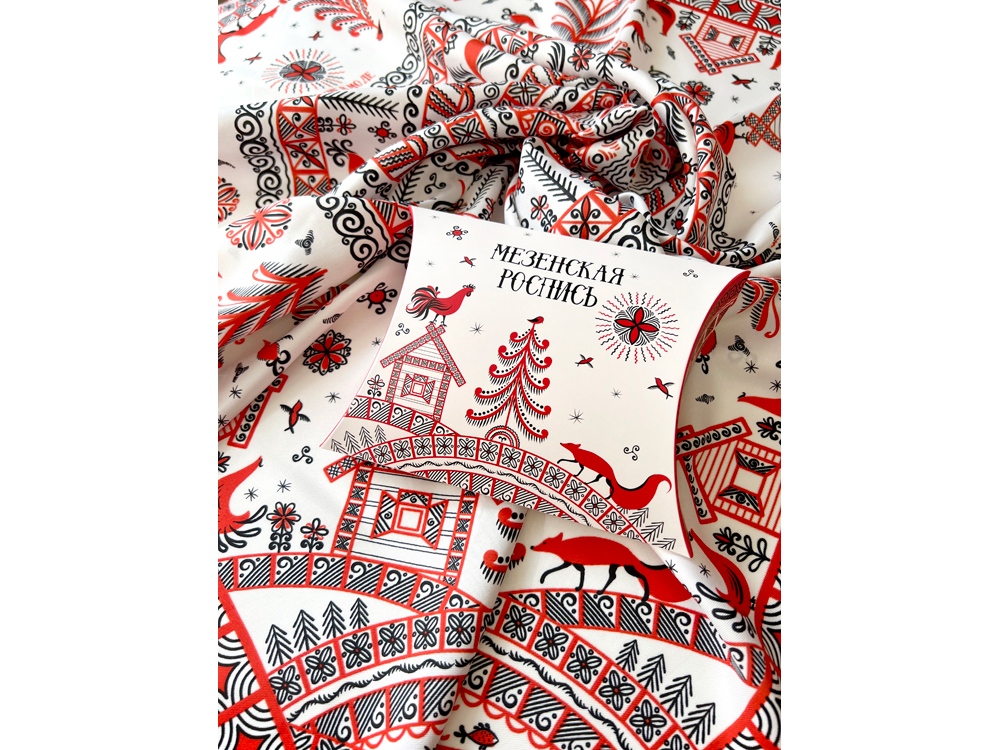 Самобытный орнамент знаменитой мезенской росписи, отличающейся зашифрованным символизмом, лег в основу элегантного платка Мезенская роспись. Петух и лиса. Каждый элемент принта имеет особое значение, и располагается в строго определенном месте, создавая целый рассказ. Ранее такими рисунками украшали избы, посуду и кухонную утварь, передавая послание поколениям.
