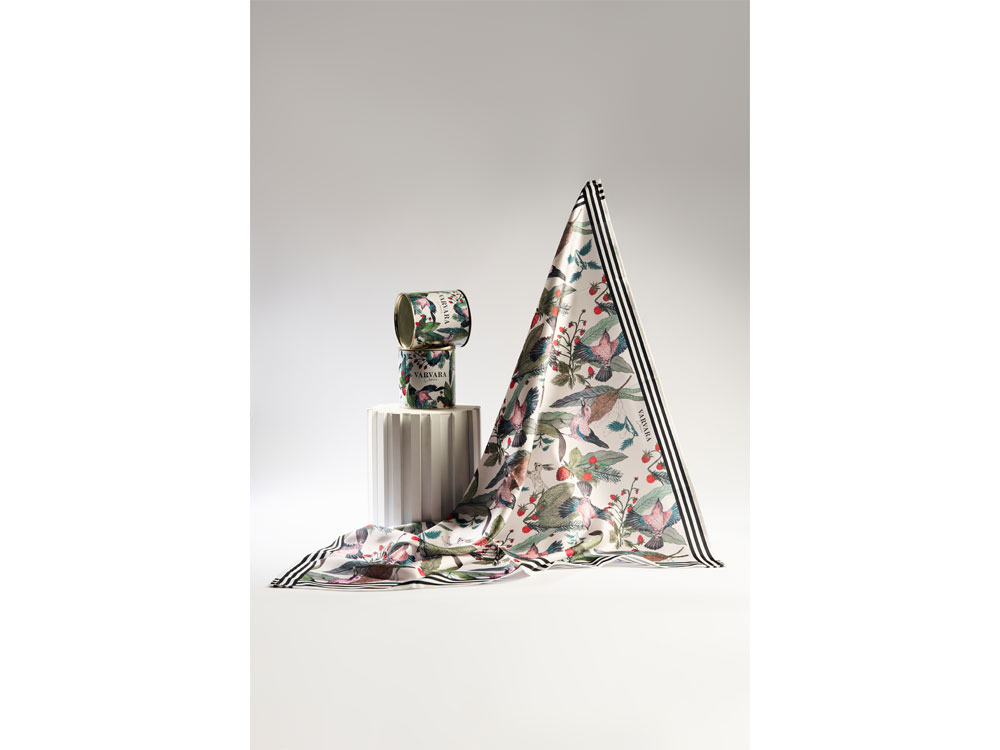 Принт нарисован художницей вручную специально для бренда Varvara. Художница размышляла на тему русской природы, культуры и искусства - тут и лесная земляника, и сочная зелень, и сказочные зайцы с фазанами. Композиция рисунка, выполненная в стиле иллюстраций к русским сказкам, переносит нас в атмосферу сказочного леса.