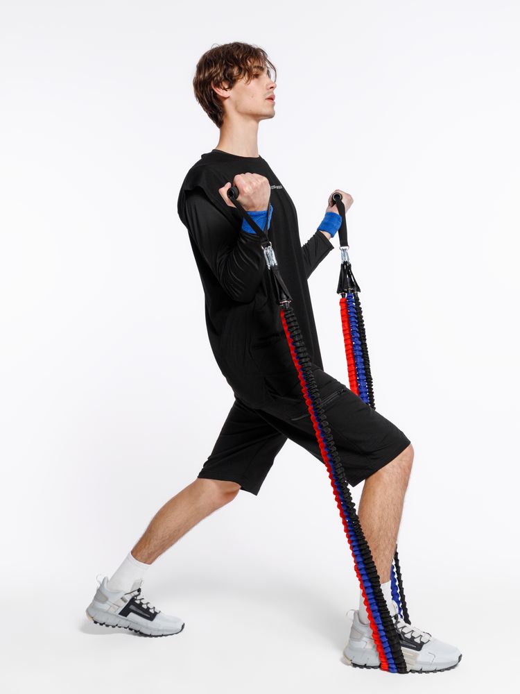 В набор входят 3 трубчатых эспандера с разной степенью нагрузки от 6,8 до 15,8 кг. Меняя и комбинируя их, можно усиливать или ослаблять нагрузку во время тренировки.