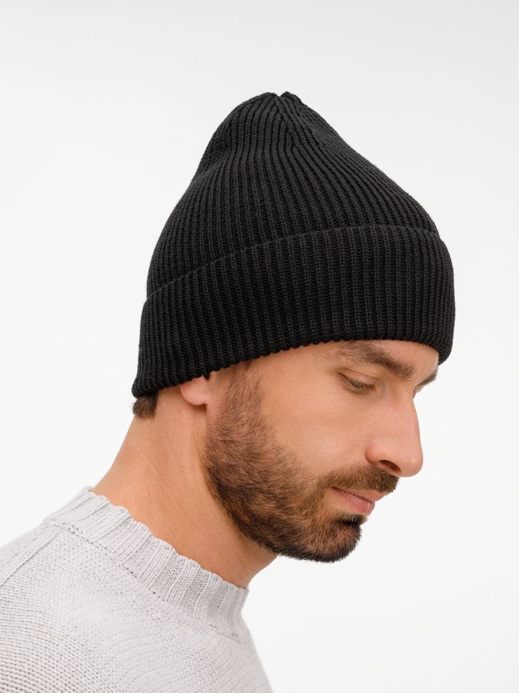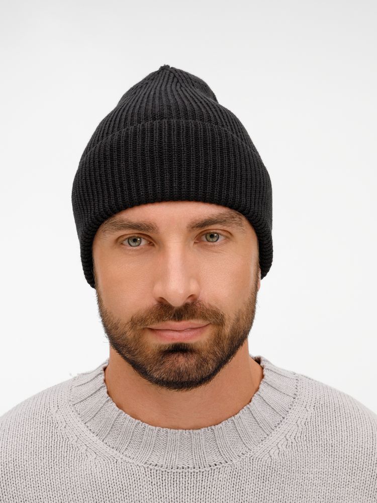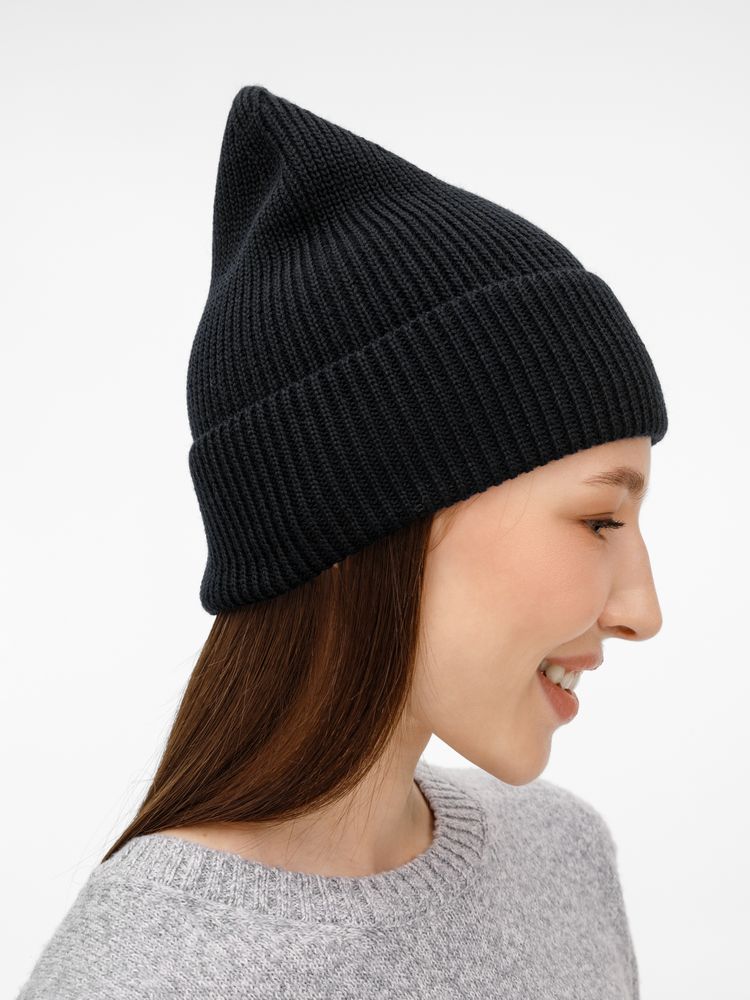 Удлиненный силуэт шапки Nobilis Mono из мягкой полушерстяной пряжи с широким отворотом создает стильный современный образ, а фактурная вязка добавляет объем и выразительность.