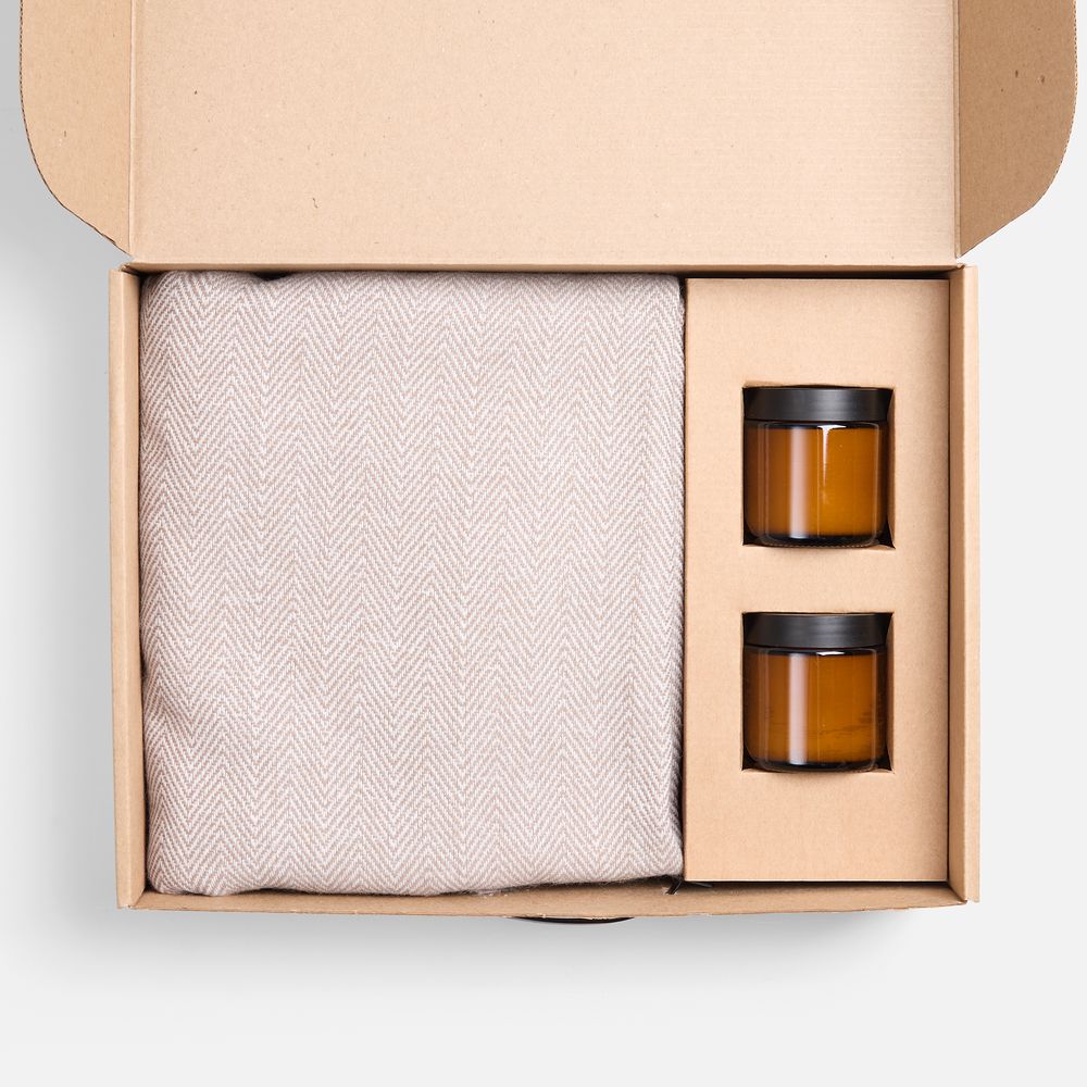 плед - шерсть, 15%; хлопок, 5%; полиэстер, 60%; акрил, 20%, плотность 200 г/м²; подсвечник - стекло, крышка - пластик; свеча - парафин, соевый воск, парфюмерная композиция; коробка - микрогофрокартон, Т-23Е