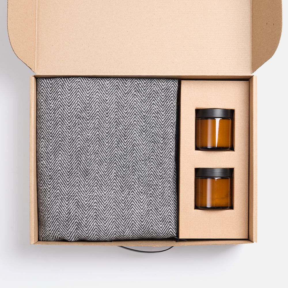 плед - шерсть, 15 %; хлопок, 5 %; полиэстер, 60 %; акрил, 20%, плотность 200 г/м²; подсвечник - стекло, крышка - пластик; свеча - парафин, соевый воск, парфюмерная композиция; коробка - микрогофрокартон, Т-23Е