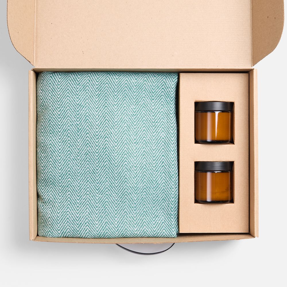 плед - шерсть, 15%; хлопок, 5%; полиэстер, 60%; акрил, 20%, плотность 200 г/м²; подсвечник - стекло, крышка - пластик; свеча - парафин, соевый воск, парфюмерная композиция; коробка - микрогофрокартон, Т-23Е