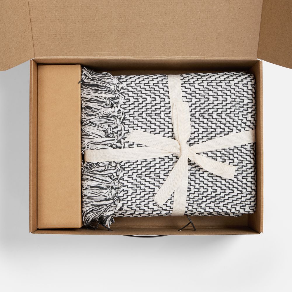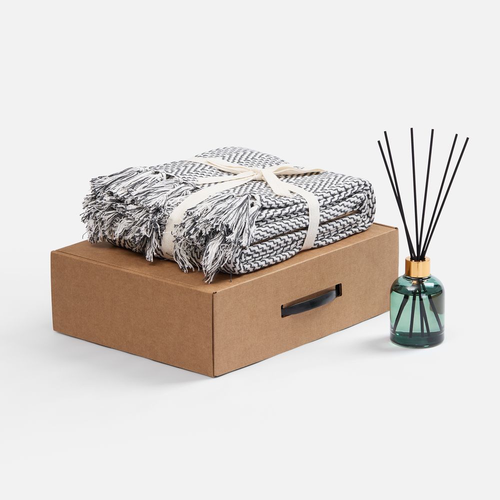 плед - хлопок 80%, полиэстер 20%, плотность 260 г/м²; флакон - стекло, палочки из файбера; коробка - микрогофрокартон