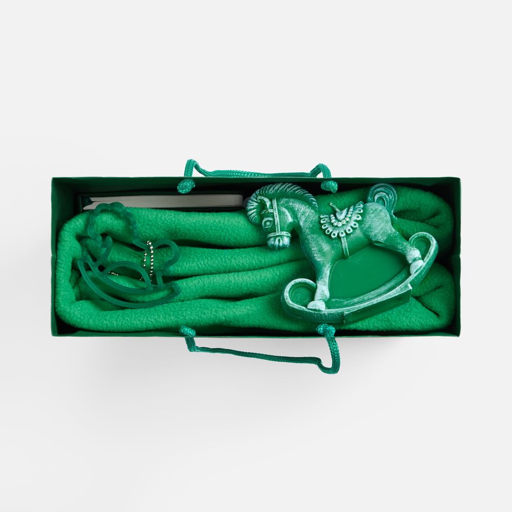 А еще у Creativerse есть своя изюминка: актуальная 3D-подвеска в форме детской лошадки-качалки, которая крепится к подарочному пакету и задает праздничный тон всему набору. Позднее она непременно станет частью повседневного образа, ведь такую милую подвеску можно прикрепить куда угодно — как символ года и просто счастливый талисман.