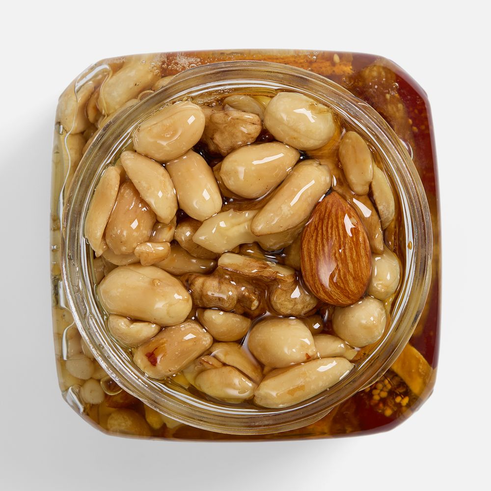 Насыщенный медовый десерт с хрустящими орехами, яркими цукатами и полезными семенами составляет идеальную партию зеленому чаю особого купажа, в основе которого нежные листья зеленого чая в обрамлении сладковатых нот кэроба и сушеного яблока. Ягоды годжи и сублимированная клубника дарят витаминную свежесть, а цветки хризантемы и апельсинового дерева — тонкий цветочный аромат.