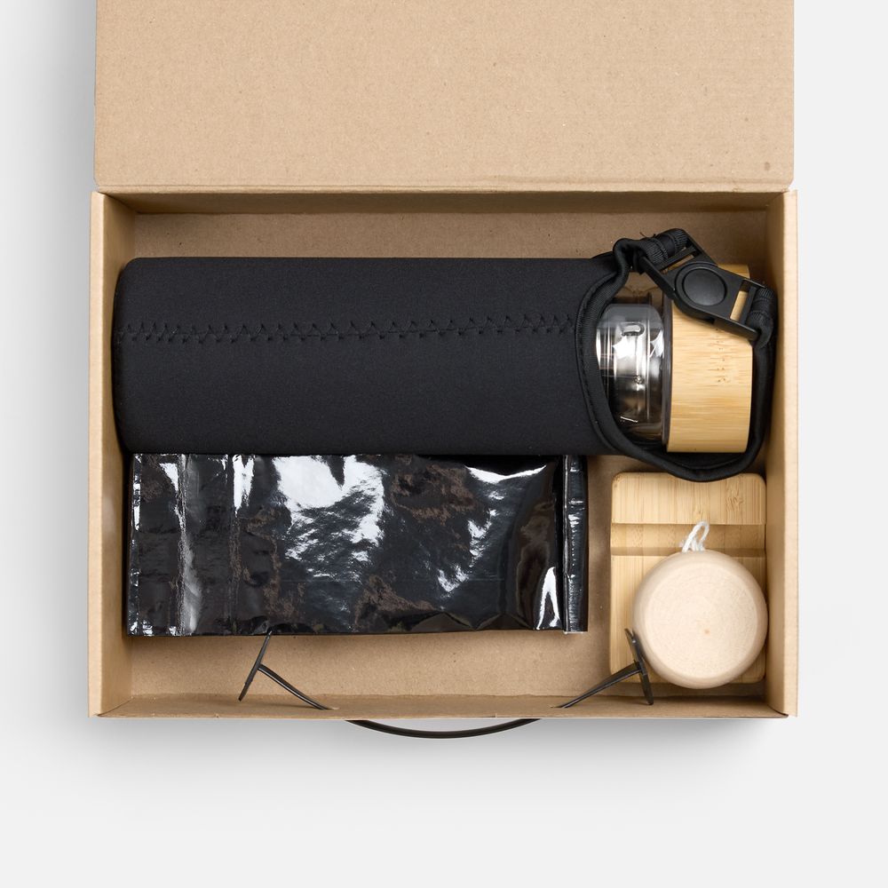 дерево; бутылка - боросиликатное стекло, чехол - неопрен; ситечко - нержавеющая сталь; крышка - бамбук, пластик; подставка - бамбук; игрушка-антистресс - дерево; коробка - микрогофрокартон