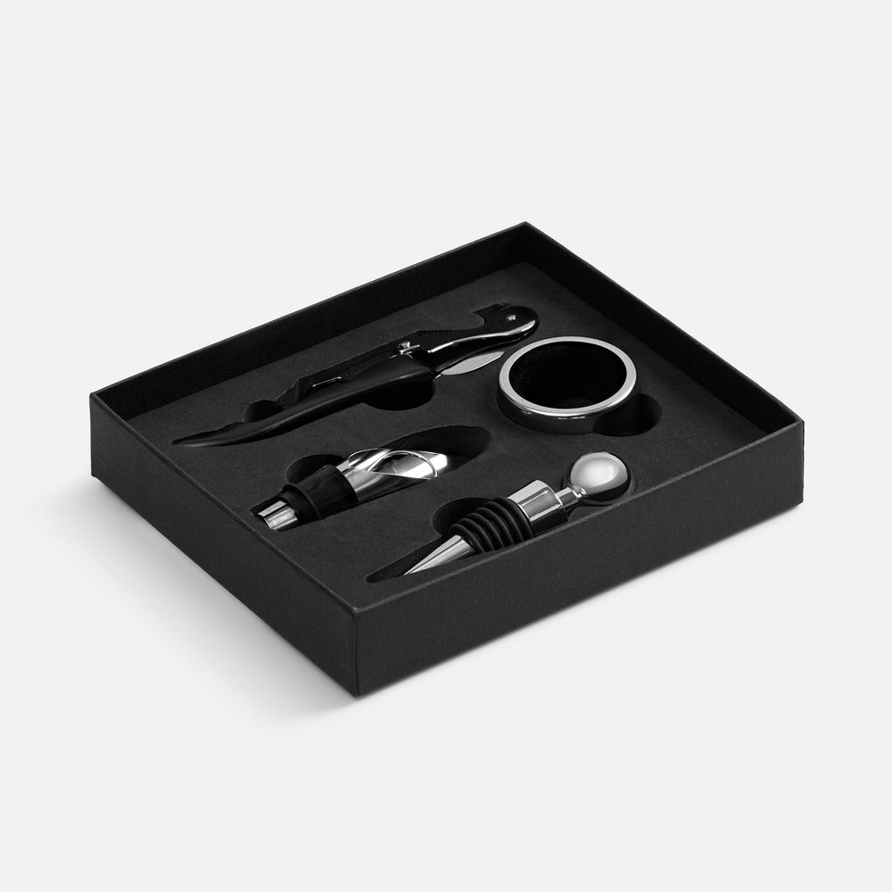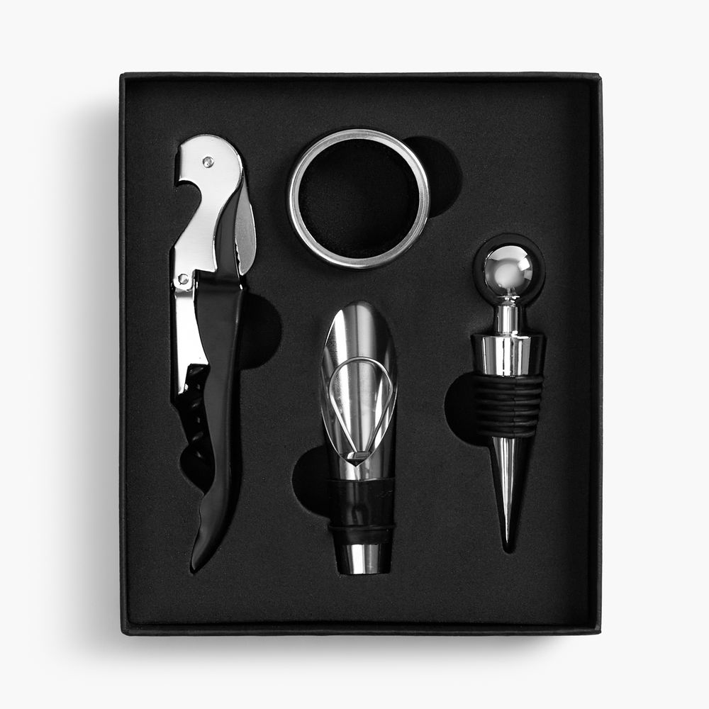 Функциональный и простой в использовании набор винных аксессуаров в лаконичной коробке.