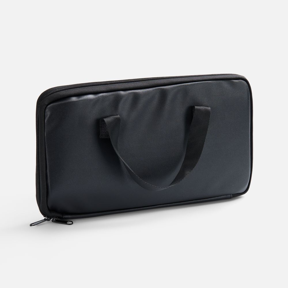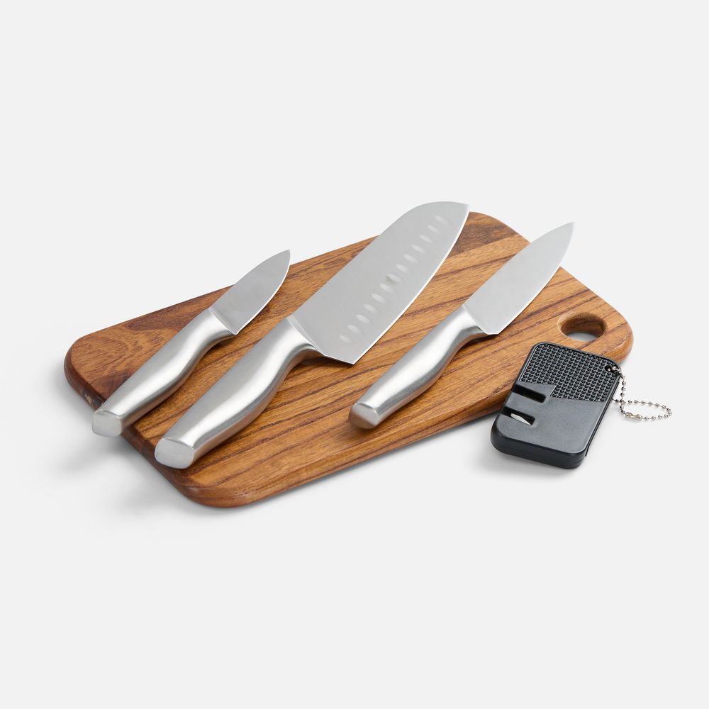 сумка: 33,5х3х19 см; точилка: 7,8х1х5 см; нож для овощей: 19,5х1,6 см; универсальный нож: 23,5х1,6 см; нож сантоку: 29,5х1,9 см; разделочная доска: 28х15,5х1,2 см; упаковка: 19,5х34,5х4,5 см