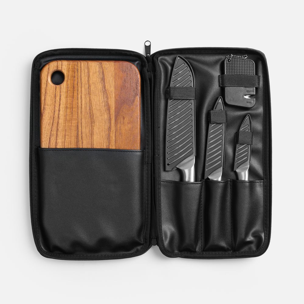лезвия ножей - нержавеющая сталь, сатинированная, 3Cr13; ножны - полипропилен; точилка для ножей - сталь, вольфрамовая, АБС, керамика; доска - дерево, вишня; сумка - ПВХ