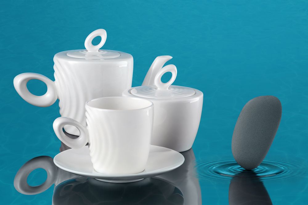 Форма сервиза создана в скульптурной технике: фарфор словно запечатлел сам момент движения. Необычная ручка предметов символизирует камень, от которого появляются завораживающие круги на воде — корпусе изделия.