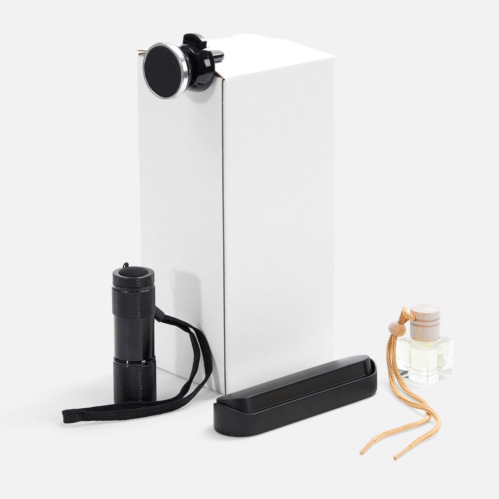 держатель - АБС-пластик; визитка - пластик; фонарик - алюминий; ароматизатор - стекло, дерево; коробка - микрогофрокартон