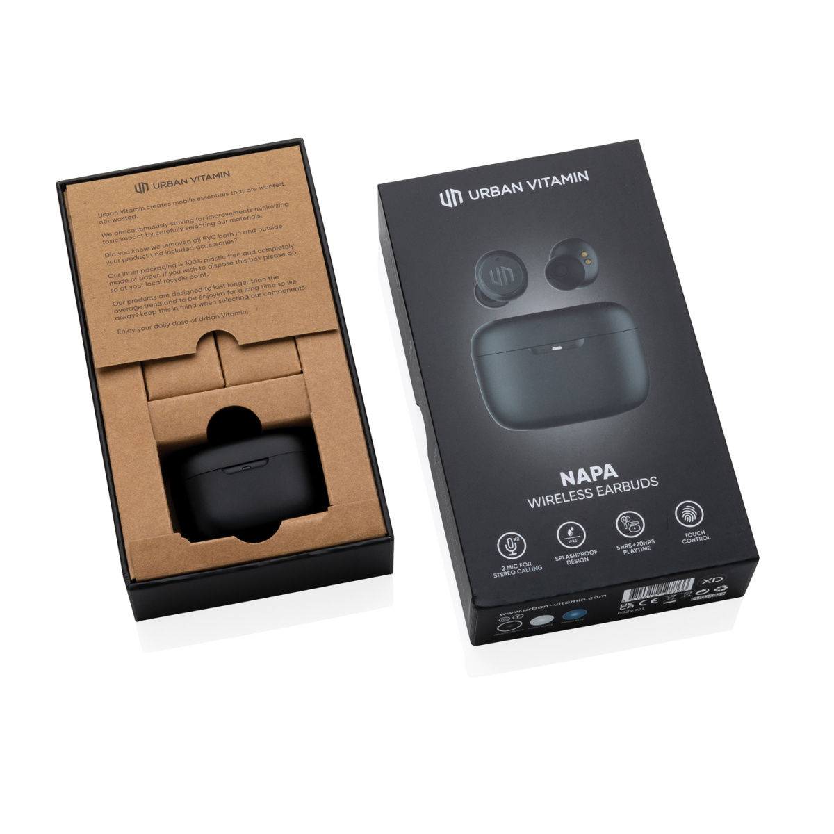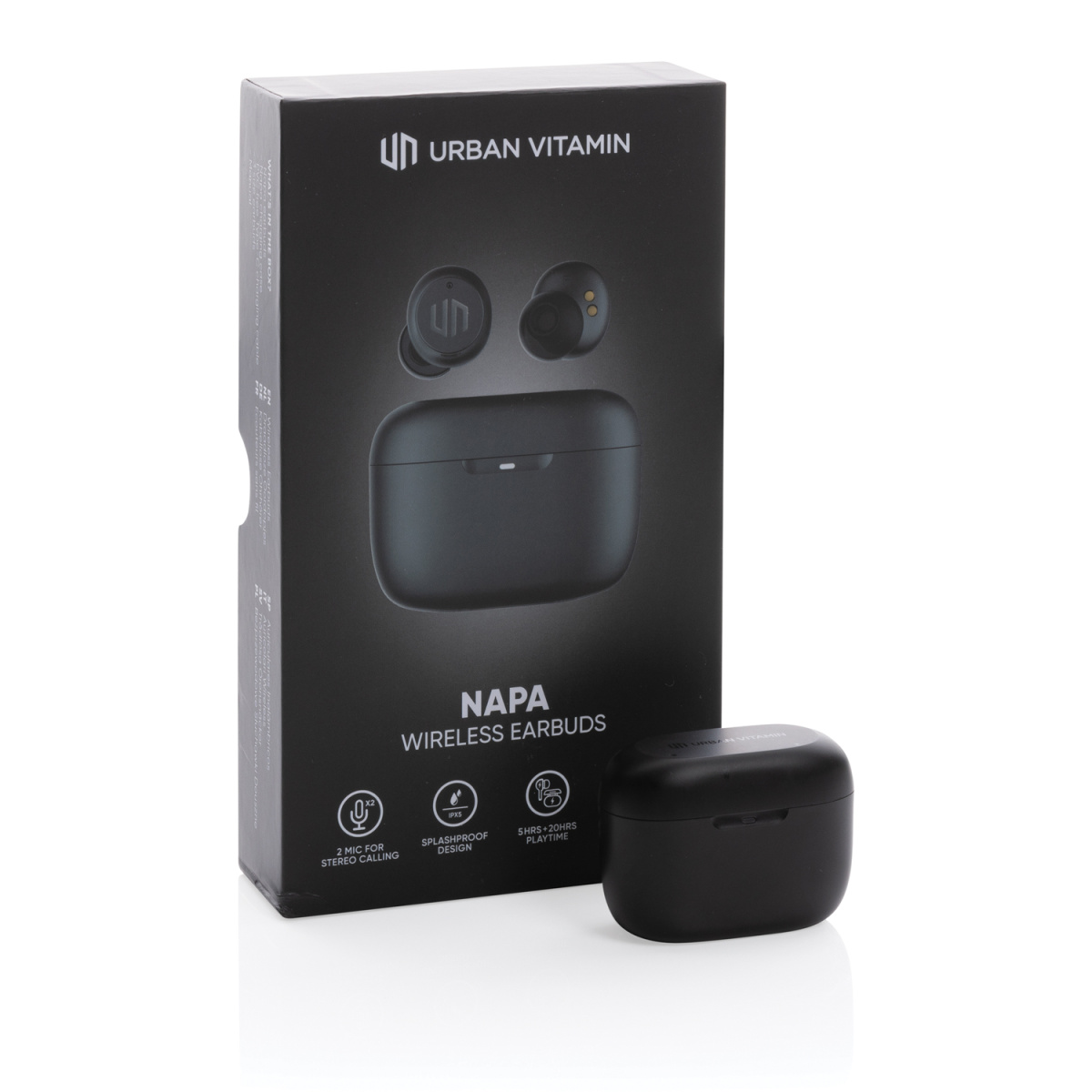 Готовы услышать по-настоящему мощные басы? Тогда наушники Napa от Urban Vitamin для вас! Невероятный звук в компактной упаковке. Стильные наушники работают до 5 часов без перерыва, после чего их легко подзарядить с помощью кейса, рассчитанного на 20 дополнительных часов. 2 встроенных микрофона обеспечивают безупречное звучание во время телефонных звонков. Просто коснитесь сенсора на наушнике, чтобы начать или завершить вызов. Степень защиты IPX 5 делает наушники устойчивыми к любым погодным условиям, поту и брызгам, поэтому они идеально подойдут для занятий спортом на свежем воздухе. Изделия Urban Vitamin не содержат ПВХ и упакованы без лишнего пластика.