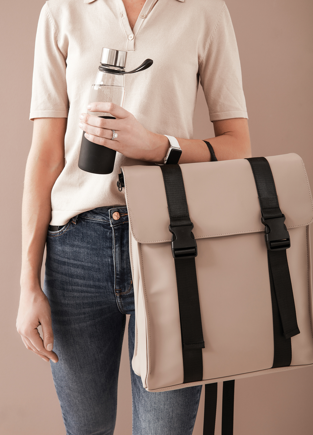 Рюкзак изготовлен из приятного на ощупь водоотталкивающего полиуретана с покрытием soft-touch. Он не боится дождя, брызг и легко очищается. У рюкзака два внутренних отделения: основное и дополнительное, для ноутбука или планшета, с мягкой подкладкой и ремнем на застежке-липучке. Телефон, наушники или другие мелочи можно расположить в трех карманах, один из которых — внутри. Все карманы застегиваются на молнии. Снаружи рюкзак дополнительно фиксируется застежками. Лямки, также изготовленные из полиуретана, можно отрегулировать по длине.